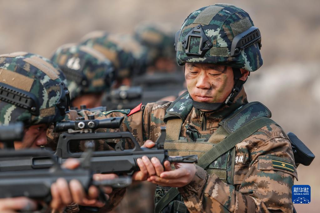 武警河北總隊某部大隊長李闖組織特戰隊員進行據槍訓練(2021年3月4日攝)。新華社發(張丹 攝)