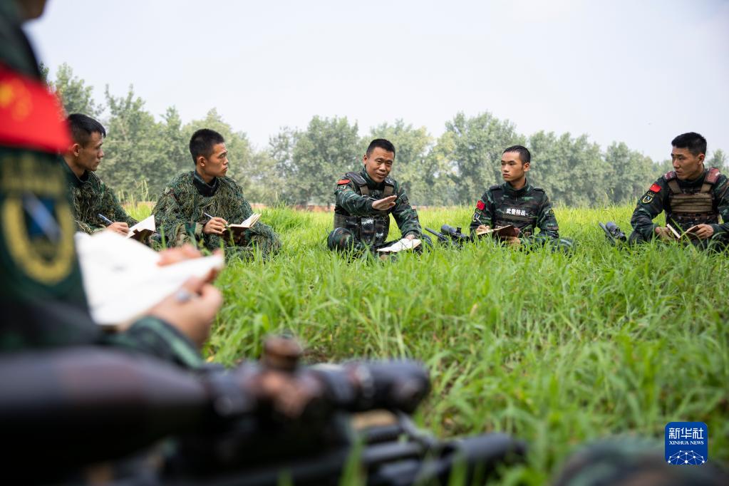 武警河北總隊某部大隊長李闖(右三)和特戰隊員進行理論研討(2022年8月3日攝)。新華社發(江騰 攝)