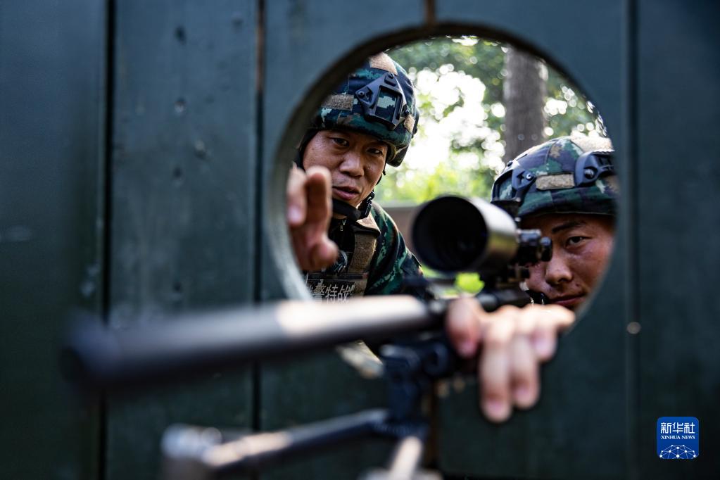 武警河北總隊某部大隊長李闖(左)指導特戰隊員狙擊訓練(2022年8月3日攝)。新華社發(江騰 攝)