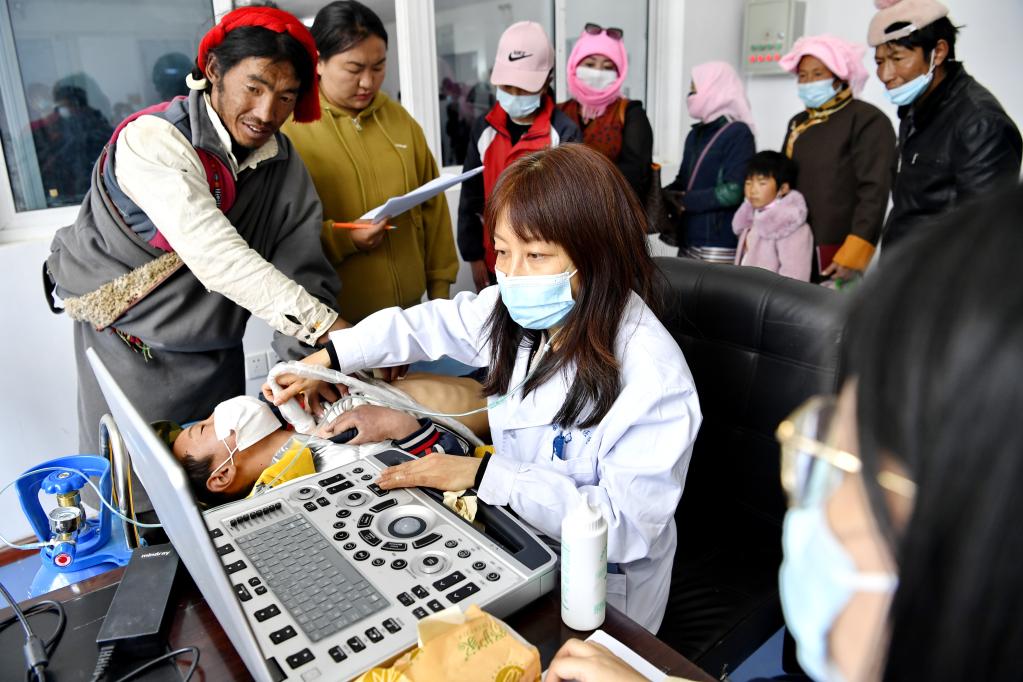 江蘇泰州市人民醫院援藏醫生在拉薩市當雄縣人民醫院為一名兒童做檢查。新華社記者李鍵攝