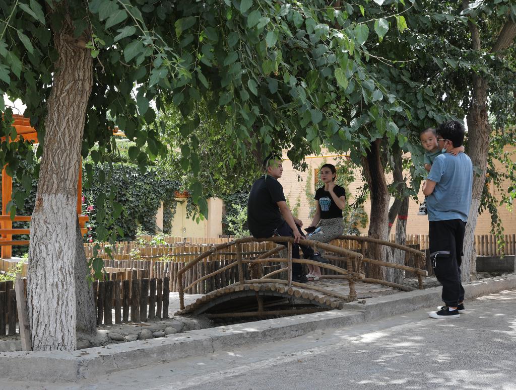 一群游客在新疆和田縣稻香村散步游覽。
