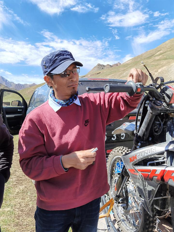 管護員強巴出發前調試巡邏用摩托車。(受訪者提供)