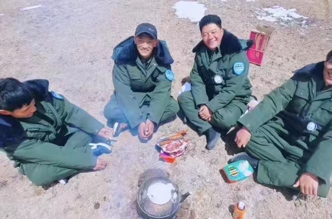 雙湖縣管護員在巡邏時用餐。(受訪者提供)