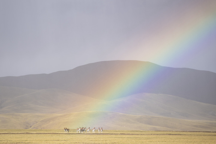 彩虹下的羌塘國家級自然保護區藏野驢。(新華社記者孫瑞博攝)