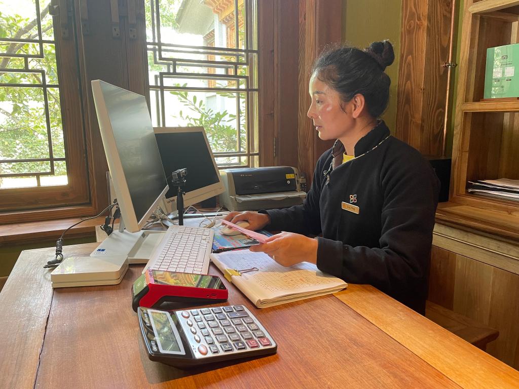 云南維西縣塔城鎮(zhèn)松贊塔城酒店負責人古麗英在操作電腦。(新華社記者楊靜攝)