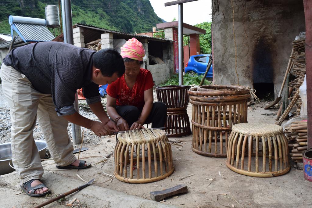 云南耿馬縣勐撒鎮(zhèn)翁達村黨總支書記俸紹春指導群眾編制藤蔑鼓凳。(受訪對象供圖)