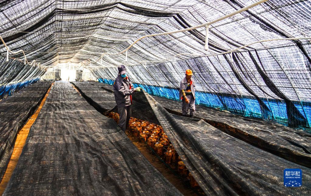 在吉林省延邊朝鮮族自治州和龍市八家子鎮(zhèn)南溝村桑黃栽培基地,村民在桑黃大棚里進行管護(2020年6月11日攝)。