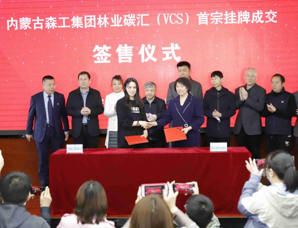 2021年4月8日,內蒙古森工集團林業碳匯(VCS)首宗掛牌成交簽售儀式在內蒙古產權交易中心完成。(受訪單位供圖)