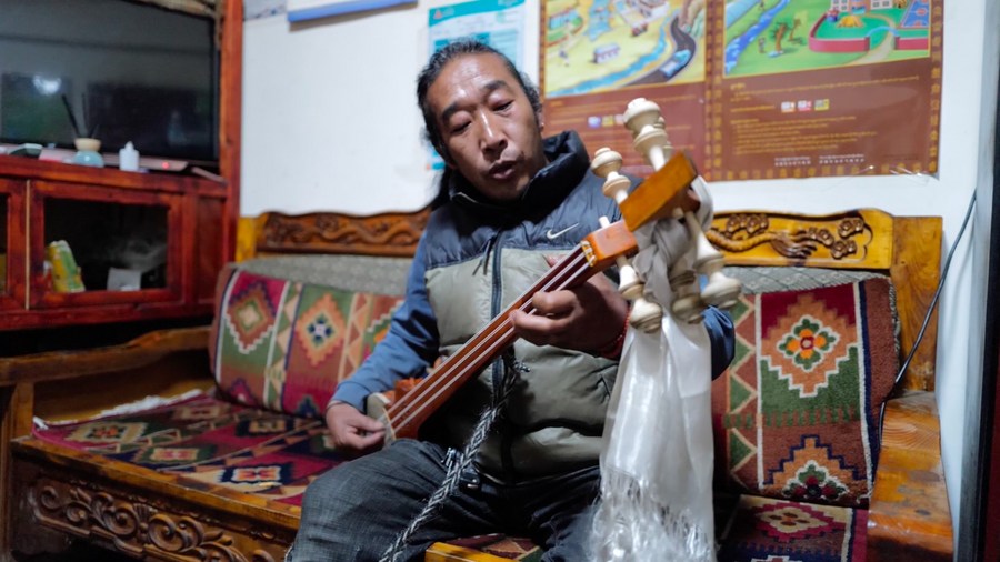 絨轄鄉居民扎西次仁在位于陳塘村的自家甜茶館里彈奏扎念琴(4月10日攝)。新華社記者 劉潁 攝