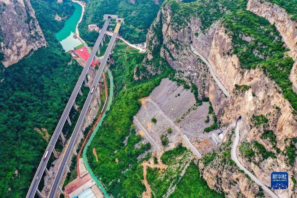 這是通過山西省長治市平順縣虹梯關鄉的高速公路(畫面左側),一旁是過去的“掛壁公路”(畫面右側)(2022年7月5日攝,無人機照片)。新華社記者 曹陽 攝