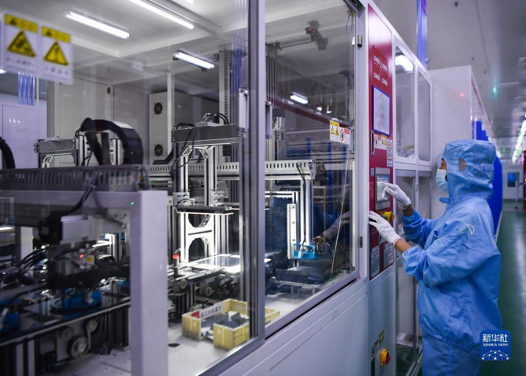 2022年7月19日,工作人員在位于陜西西安的隆基綠能科技股份有限公司單晶硅太陽能電池工廠內調試設備。新華社記者 張博文 攝
