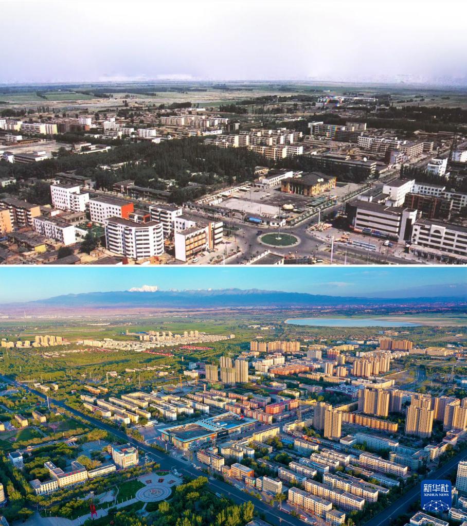 拼版照片:上圖為2000年拍攝的新疆生產建設兵團農六師五家渠市(資料照片);下圖為2020年7月26日無人機拍攝的新疆生產建設兵團第六師五家渠市(李華北攝)。新華社發