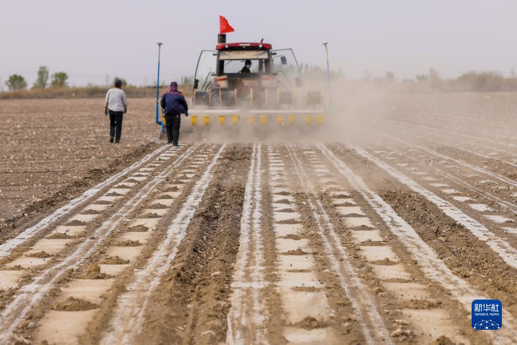 在新疆生產建設兵團第六師共青團農場的棉田里,職工操作搭載北斗導航系統的播種機進行春播(2022年4月19日攝)。新華社記者 丁磊 攝
