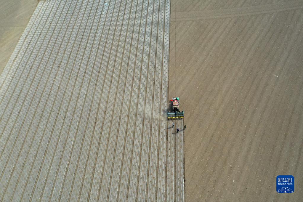 在新疆生產建設兵團第六師共青團農場的棉田里,職工操作搭載北斗導航系統的播種機進行春播(2022年4月19日攝,無人機照片)。新華社記者 丁磊 攝