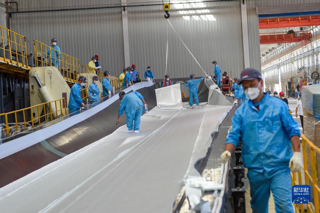 新疆生產建設兵團新星經濟技術開發區一家風電葉片企業的員工在車間忙碌(2022年7月27日攝)。新華社記者 丁磊 攝