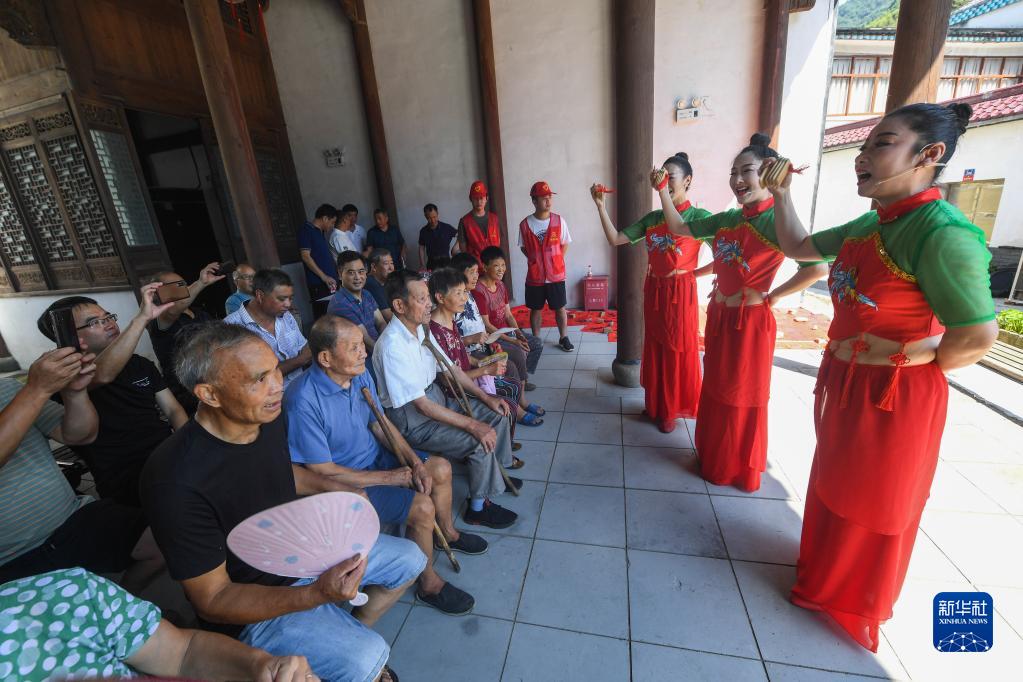 浙江省杭州市臨安區高虹鎮廉政文藝宣傳隊在石門村表演快板小段《清廉高虹》(2021年9月1日攝)。新華社記者 徐昱 攝