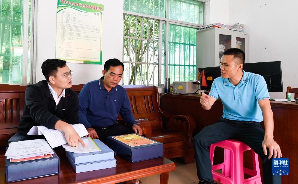 在海南省瓊中黎族苗族自治縣灣嶺鎮加章村委會,紀檢監察干部(左一)在查閱鄉村振興及村級財務支出相關材料(2021年11月13日攝)。新華社記者 楊冠宇 攝