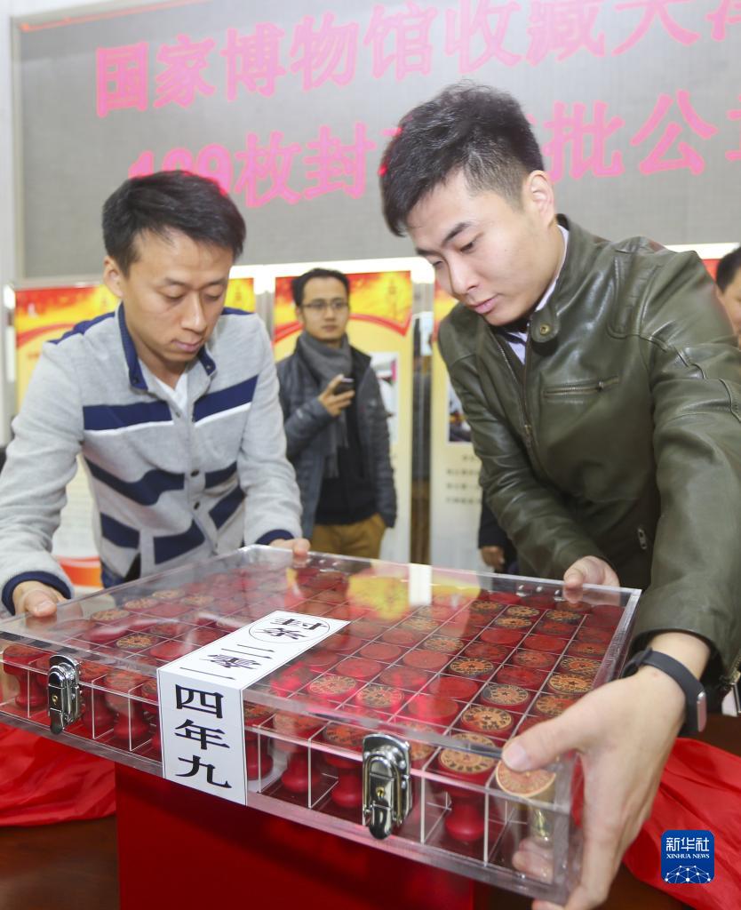 2014年11月15日,國(guó)家博物館工作人員搬走天津?yàn)I海新區(qū)109枚封存審批公章。新華社發(fā)(付文超 攝)