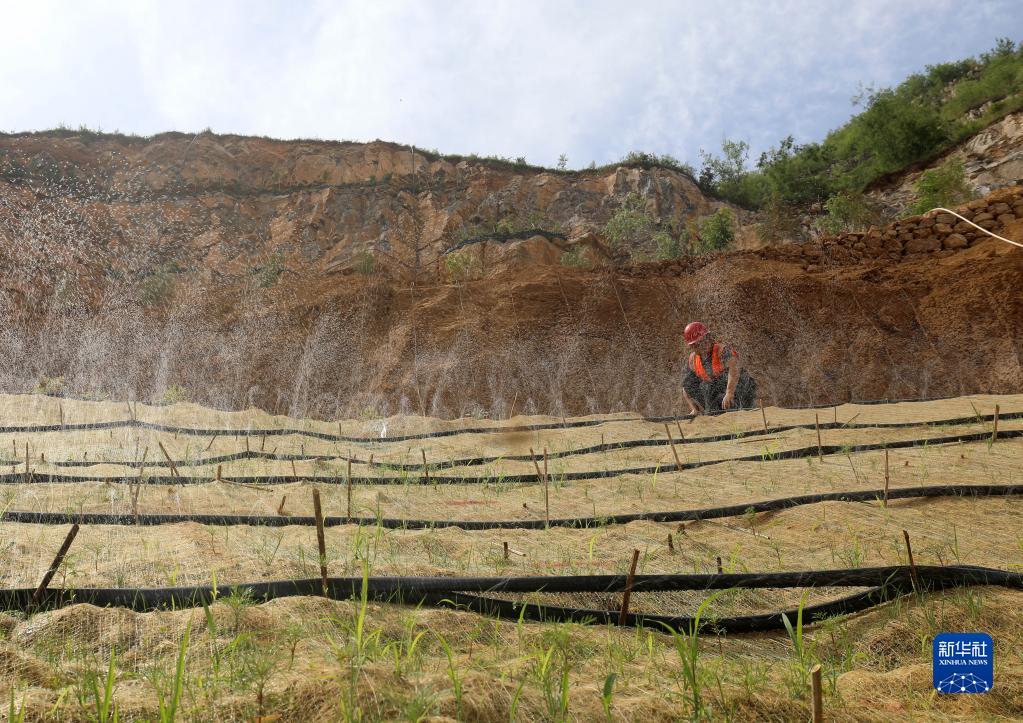 2022年6月2日,在位于石家莊市井陘縣威州鎮南固底村的河北省太行山區礦山掌子面治理技術試驗項目現場,工作人員在檢查噴淋設備。新華社記者 駱學峰 攝