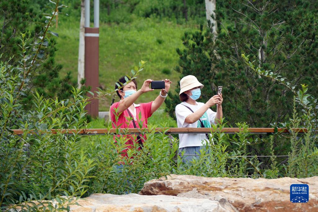 2022年7月19日,居民在河北邯鄲武安市九龍山礦山生態修復公園拍照游玩。新華社記者 駱學峰 攝