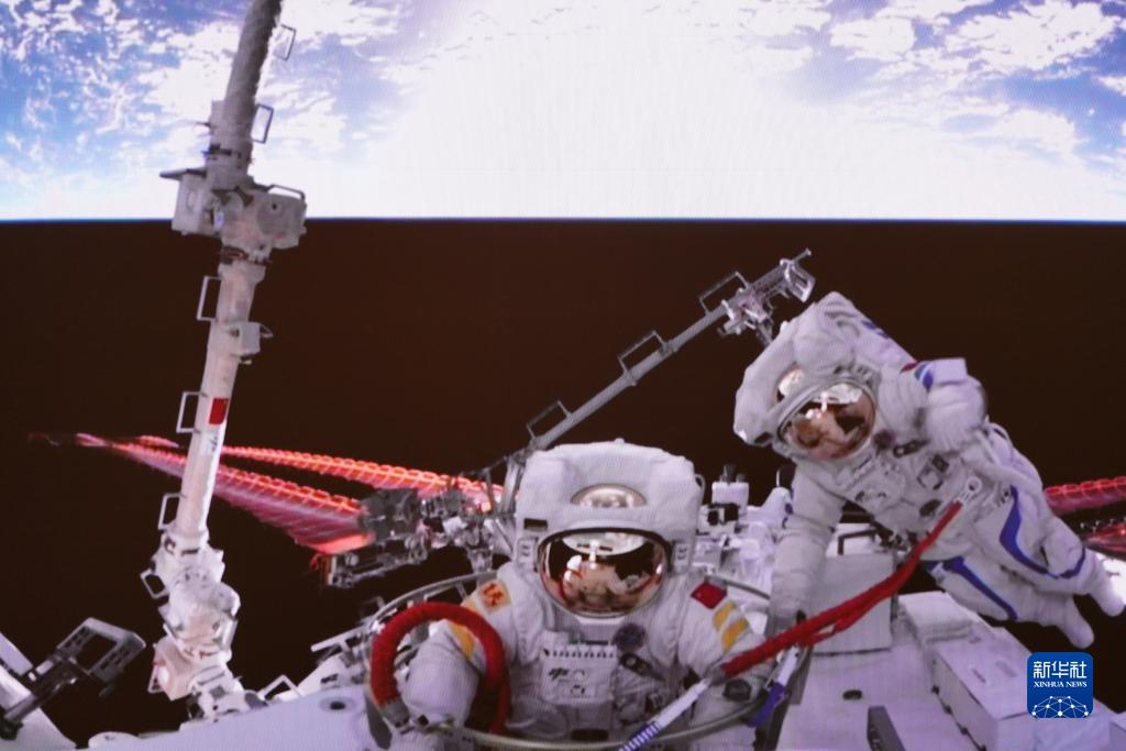 2022年9月2日在北京航天飛行控制中心拍攝的神舟十四號航天員劉洋(左)結束出艙任務正在返回的畫面。 新華社發(李杰攝)