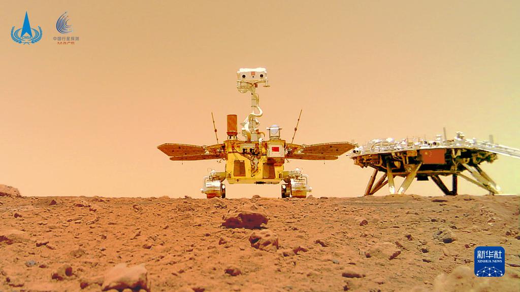這是“著巡合影”圖。2021年6月11日,國家航天局在北京舉行天問一號探測器著陸火星首批科學影像圖揭幕儀式,公布了由祝融號火星車拍攝的著陸點全景、火星地形地貌、“中國印跡”和“著巡合影”等影像圖。首批科學影像圖的發布,標志著我國首次火星探測任務取得圓滿成功。 新華社發(國家航天局供圖)