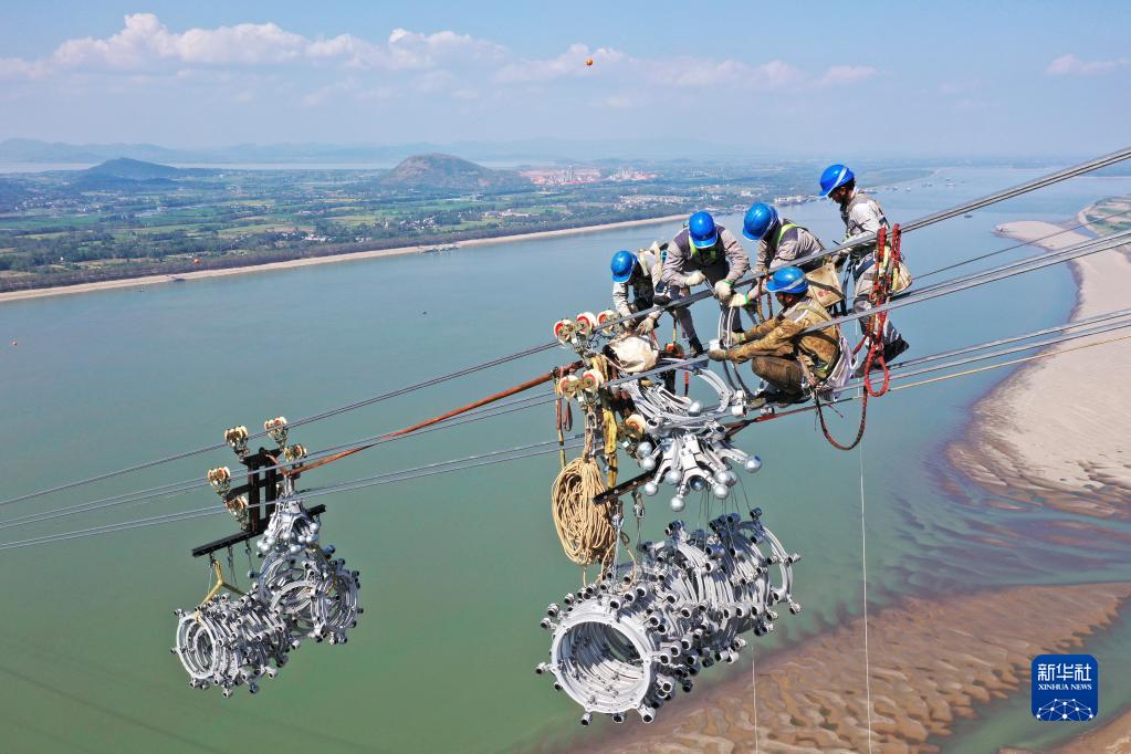 2022年9月16日,白鶴灘至浙江±800千伏特高壓直流輸電工程(白浙線)安徽段順利完成長江大跨越放線作業。白浙線是我國實施“西電東送”戰略的重點工程(無人機照片)。 新華社發(趙獻富 攝)