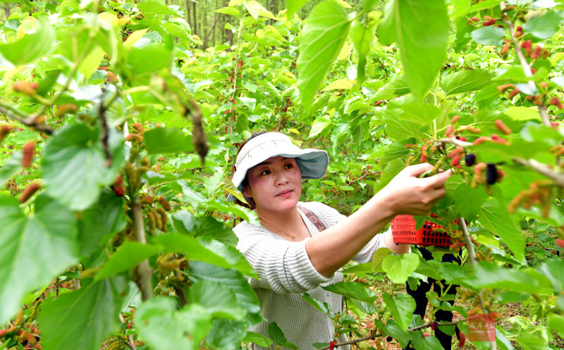 4月20日,赤壁市官塘驛鎮龍鳳山村碩果豐果業有限公司基地,游客正進園采摘桑葚。