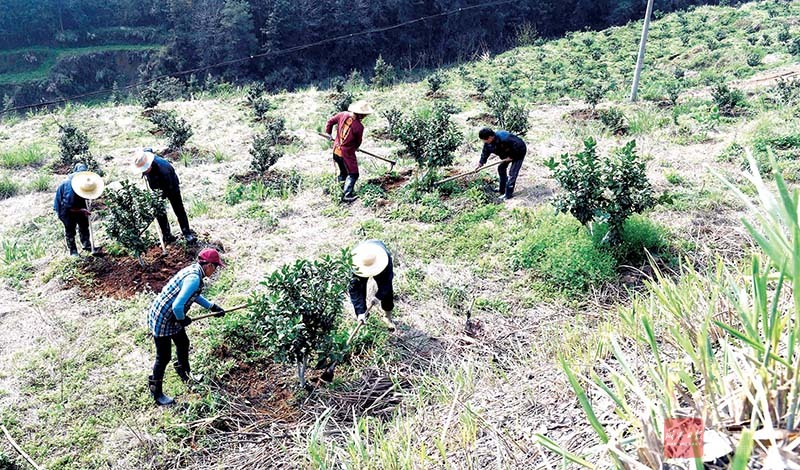 3月24日,通山縣南林橋鎮高橋村優質桔橙基地,當地農民在進行除草管理。