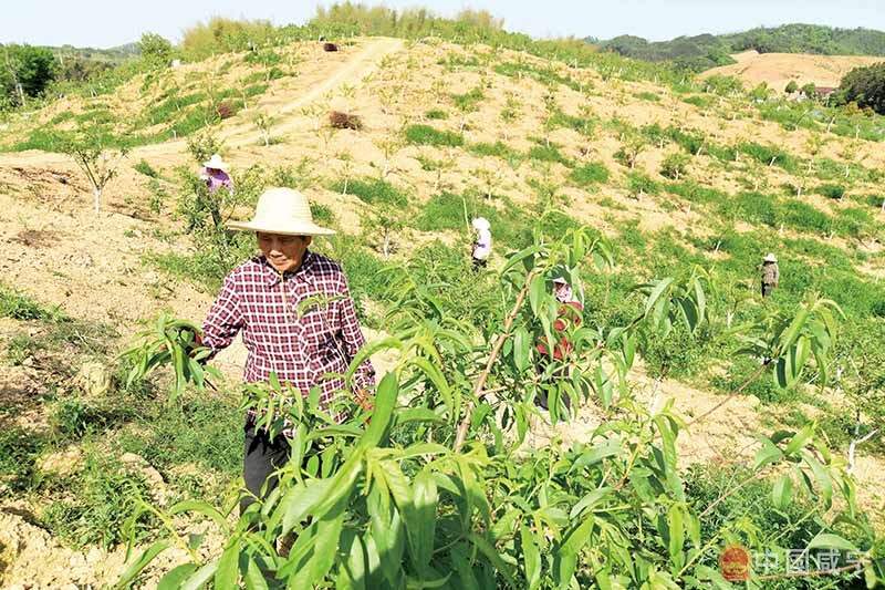 8日,咸安區(qū)向陽湖鎮(zhèn)廣東畈村十六組,聚友農(nóng)業(yè)生態(tài)有限公司桃園基地,村民為30畝新栽種的桃樹打嫩枝。