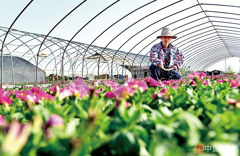 4月12日,赤壁市柳山湖鎮塔里山農業有限責任公司基地,管理員正在給矮牽牛澆水。