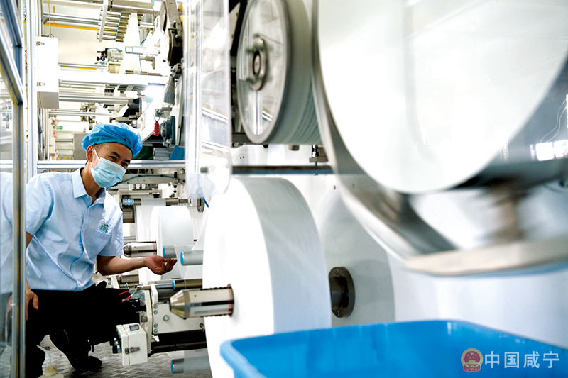 5月17日,在通城縣坪山高新技術開發區湖北艾舒寶生活用品有限公司,員工在生產、包裝、檢測高附加值的衛生新產品。