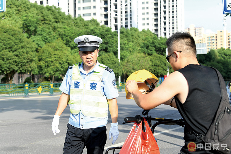14日,溫泉城區(qū),市公安局交警正在勸導(dǎo)市民戴好頭盔騎行。
