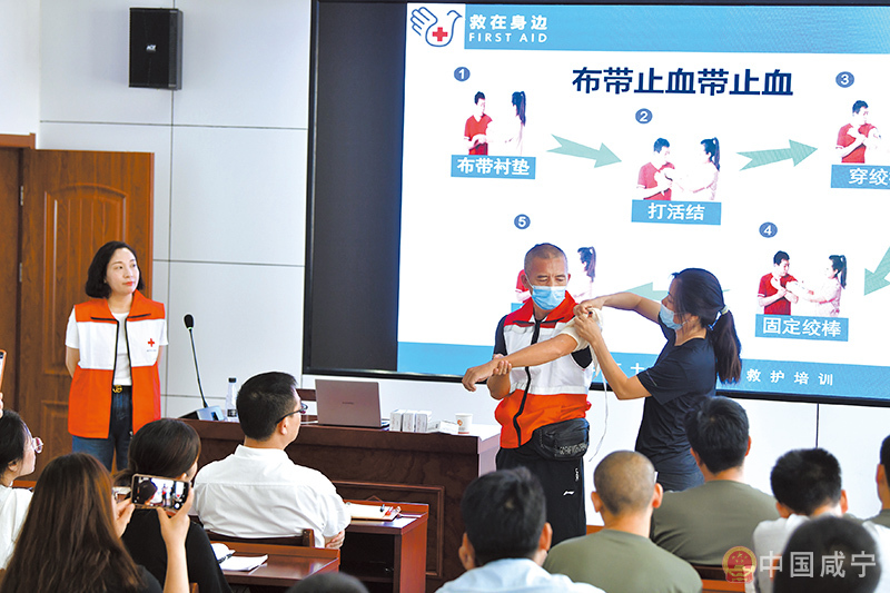 9日,市退役軍人事務局會議室,機關干部職工在市紅十字會工作人員的指導下學習應急救護操作要領。
