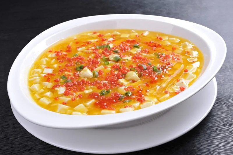 豆腐是中國的傳統食品,為補益清熱養生食品,常食可補中益氣、清熱潤燥、生津止渴、清潔腸胃。而蛋黃和豆腐一起烹調,雖然不是真正的蟹黃,但味道卻勝過蟹黃。嫩豆腐細滑、咸蛋黃咸鮮中略有顆粒感,就著滾燙的豆腐都能下兩碗飯。