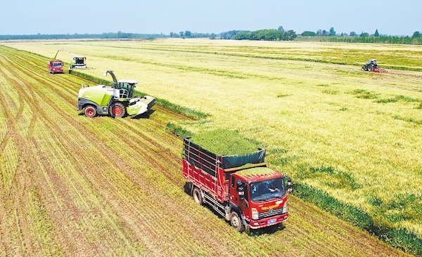 4月21日,在當陽市草埠湖鎮符臺村飼料田,大型聯合收割機和運輸車來回穿梭。(湖北日報全媒記者 劉曙松 通訊員 魏茜 攝)