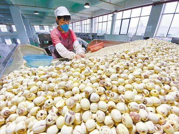 嘉魚縣湖北聯創食品有限公司員工正在精選原粒湘蓮?! 。ê比請笕接浾摺£愑隆⊥ㄓ崋T 盧建 攝)