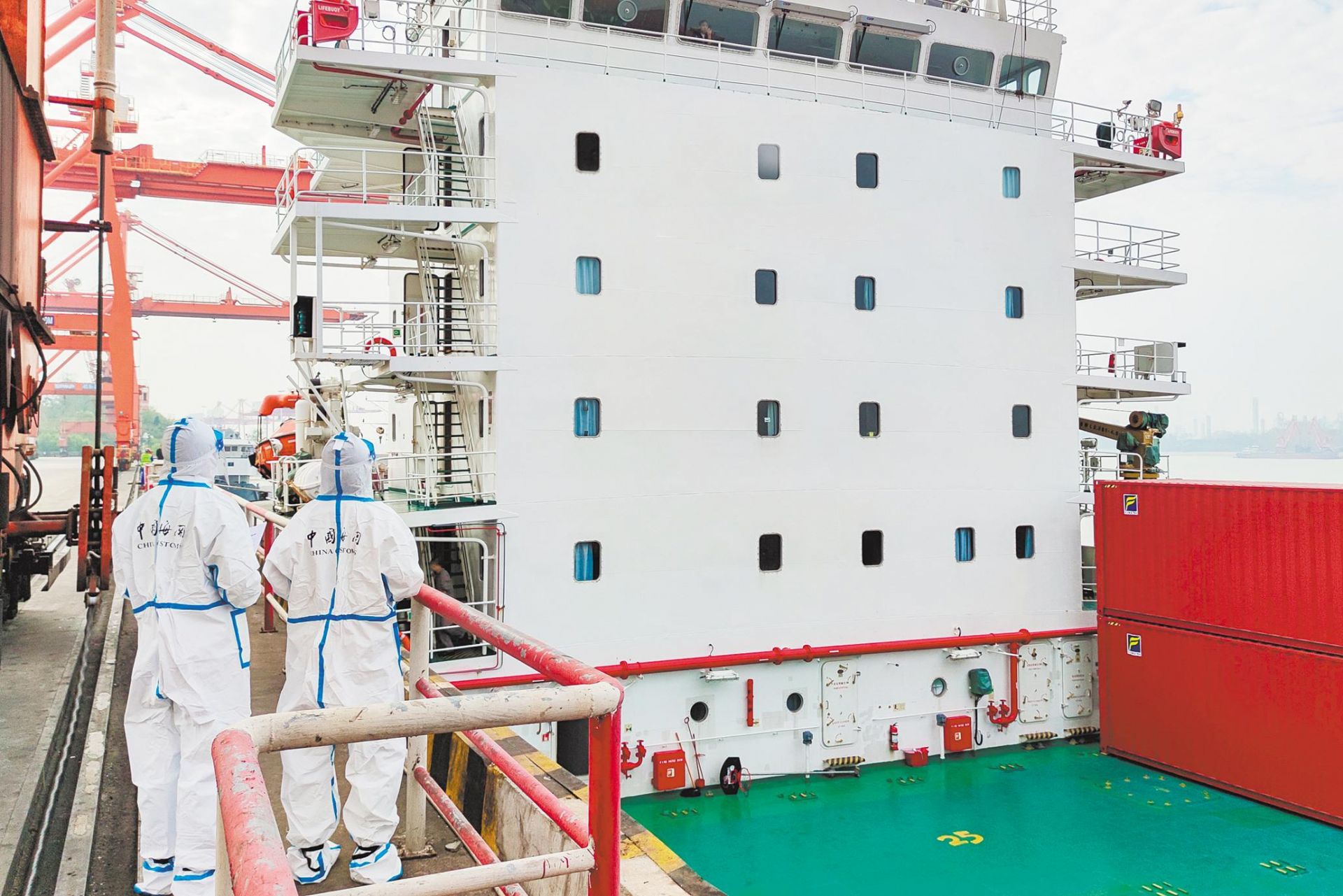 武漢海關關員對出境江海直航船舶進行現場監管?!。ū景鎴D片均為通訊員 武關宣 攝)