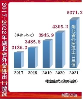 2017年湖北進出口首超3000億元。2020年,盡管湖北遭遇新冠肺炎疫情嚴重沖擊,外貿仍持續向好,成功邁進4000億元臺階。2021年,湖北進出口總值突破5000億元,達5371.2億元,創同期歷史新高。從2017年的3136.3億元,到2021年的5371.2億元,5年凈增量接近2013年外貿總值。