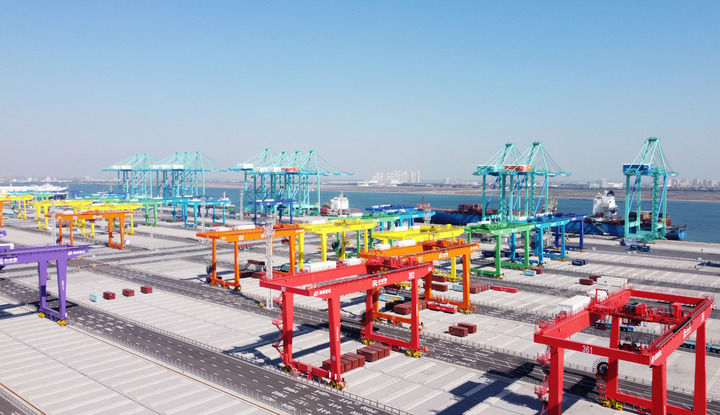 這是天津港北疆港區C段智能化集裝箱碼頭(2021年10月17日攝,無人機照片)。新華社記者 趙子碩 攝
