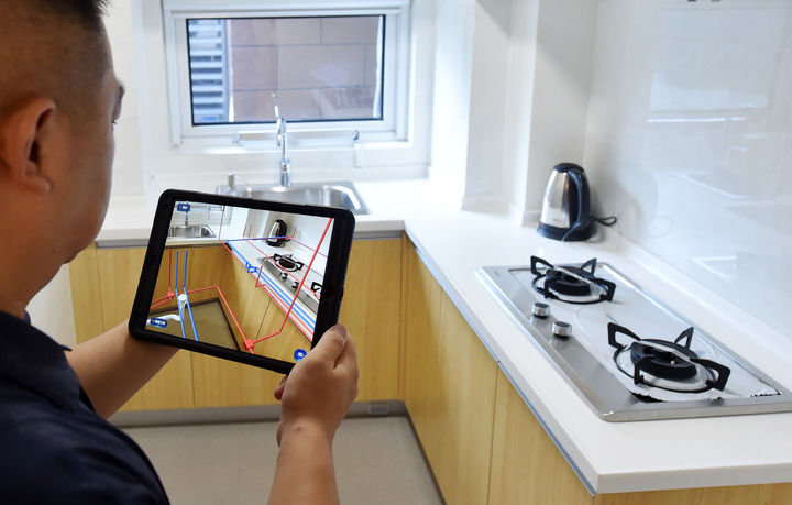 在中新天津生態城一小區,小區業主通過AR房屋使用說明書查看廚房管道線路(2020年8月13日攝)。新華社記者 趙子碩 攝