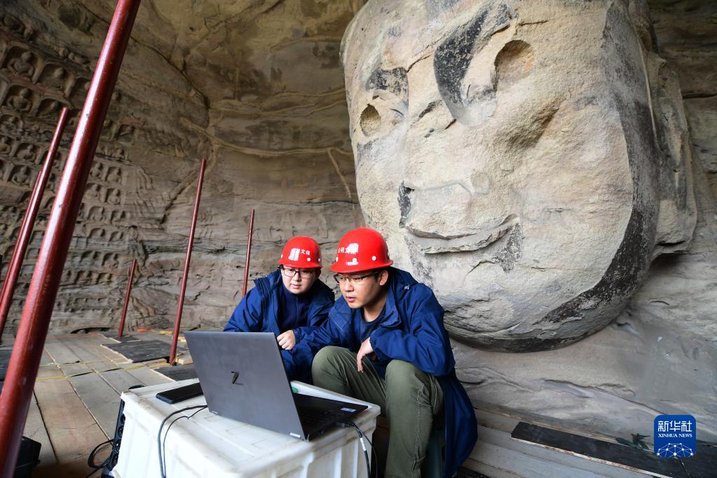 5月11日,在云岡石窟第17窟,工作人員在分析采集到的石窟數據信息。新華社記者 楊晨光 攝