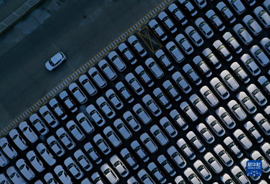 2021年1月29日,一輛運送中的商品車行駛在大連港汽車碼頭(無人機照片)。新華社記者 姚劍鋒 攝