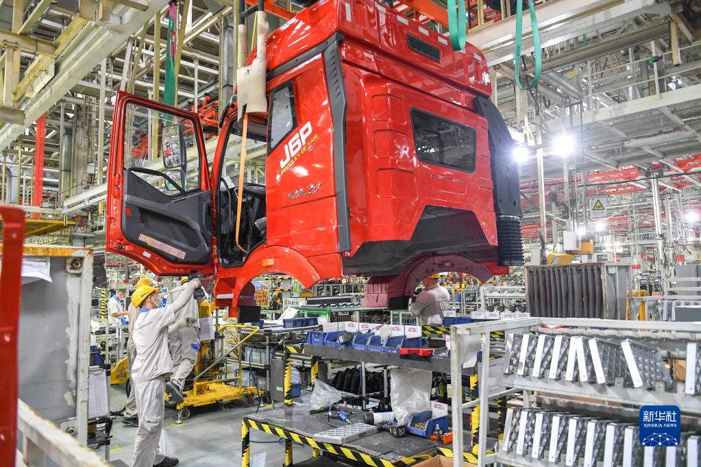 工人在位于吉林省長春市的一汽解放總裝車間裝配車輛(2021年7月7日攝)。新華社記者 張楠 攝