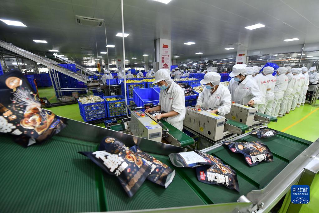 在廣西柳州市螺螄粉生產集聚區的廣西善元食品有限公司螺螄粉生產車間,工人在生產線上包裝產品(1月6日攝)。新華社記者 黃孝邦 攝