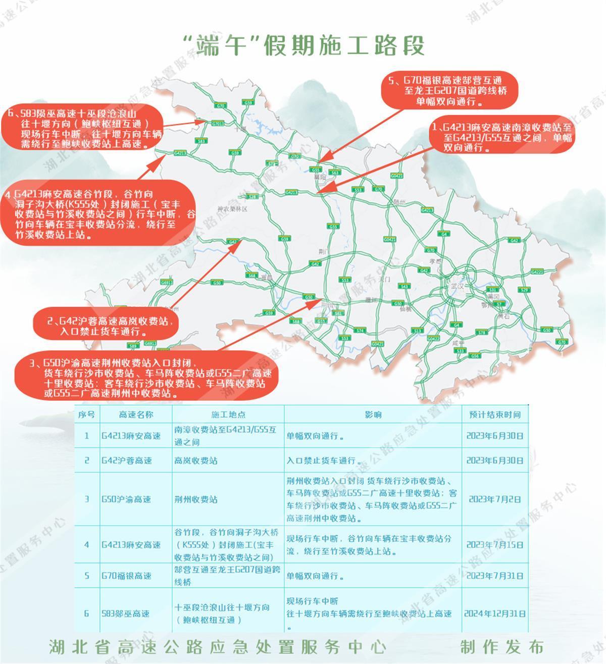 “端午”假期,全省高速公路路網(wǎng)共有6處施工點(diǎn),主要在襄陽(yáng)、宜昌、荊州、十堰地區(qū)部分國(guó)省道干線,請(qǐng)廣大司乘注意繞行。