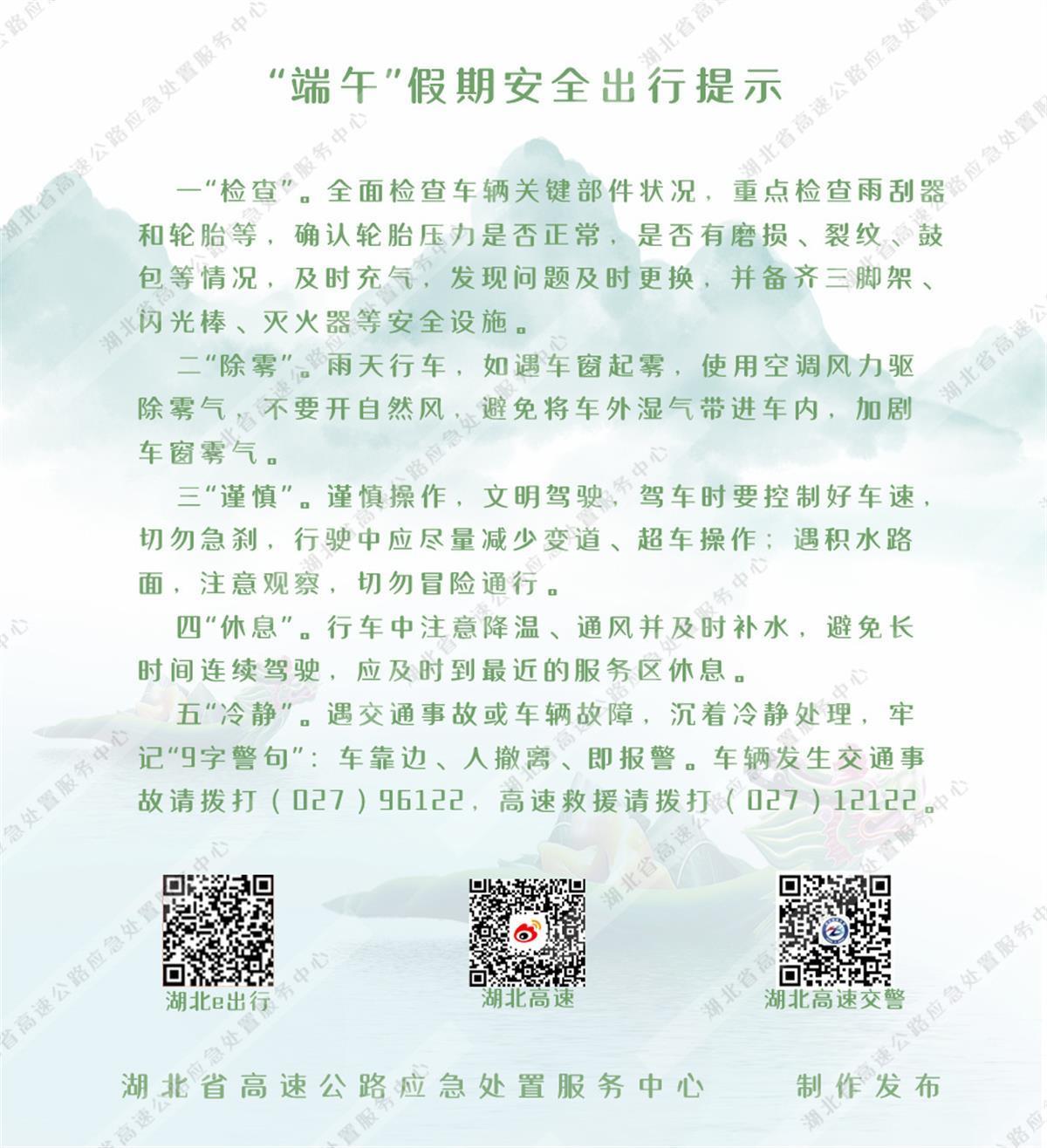 需要提醒的是,端午正值梅雨季節(jié),暴雨、強(qiáng)對(duì)流天氣易發(fā)。據(jù)天氣預(yù)報(bào),假期期間除鄂東南地區(qū)有陣雨或雷雨外,全省其他大部分地區(qū)以多云天氣為主。咸寧、黃石、黃岡南部等地需防范降雨造成的低能見度和路面濕滑疊加較大的車流量對(duì)交通安全的影響。提醒廣大司乘雨天行駛注意安全。
