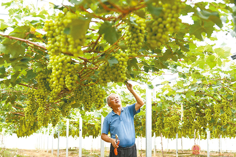 7月19日,位于咸安區橫溝橋鎮楊畈村的湖北沁豐農業葡萄采摘園,葡萄架下的葡萄碩果累累,管護員在為陽光玫瑰葡萄藤蔓綁枝。
