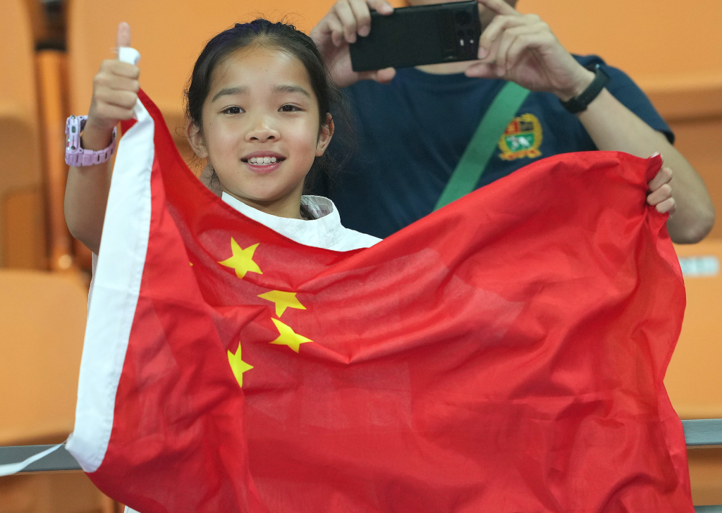 9月27日,觀眾在頒獎(jiǎng)儀式上為中國(guó)隊(duì)選手加油。新華社記者 萬(wàn)象 攝