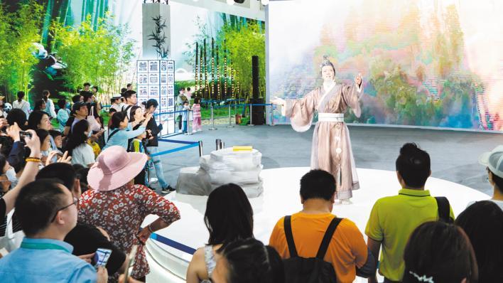 許爽是武漢理工大學學生,她和同學王思月一起來逛文博會。“浙江館是我們逛的第一個展廳,淡淡的青綠色彩、紗簾上的詩句,很有江南的情調。特別是點茶的體驗,真的是一分鐘的穿越之旅,太有趣了。”